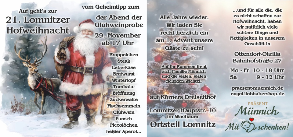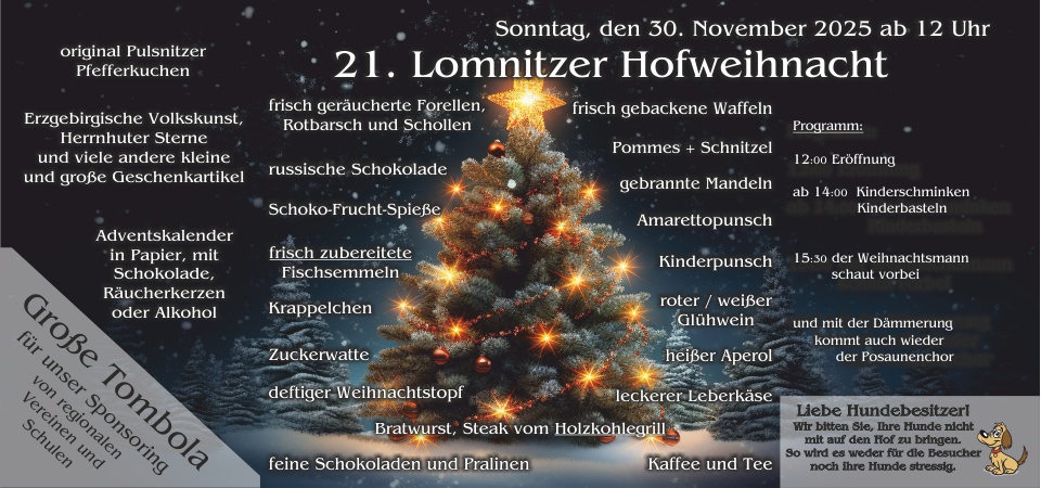 Wir, und die vielen, vielen fleißigen Wichtel laden Sie recht herzlich ein zur nunmehr 21. Lomnitzer Hofweihnacht unser Gast auf unserem Hof im Wachauer Ortsteil Lomnitz zu sein.